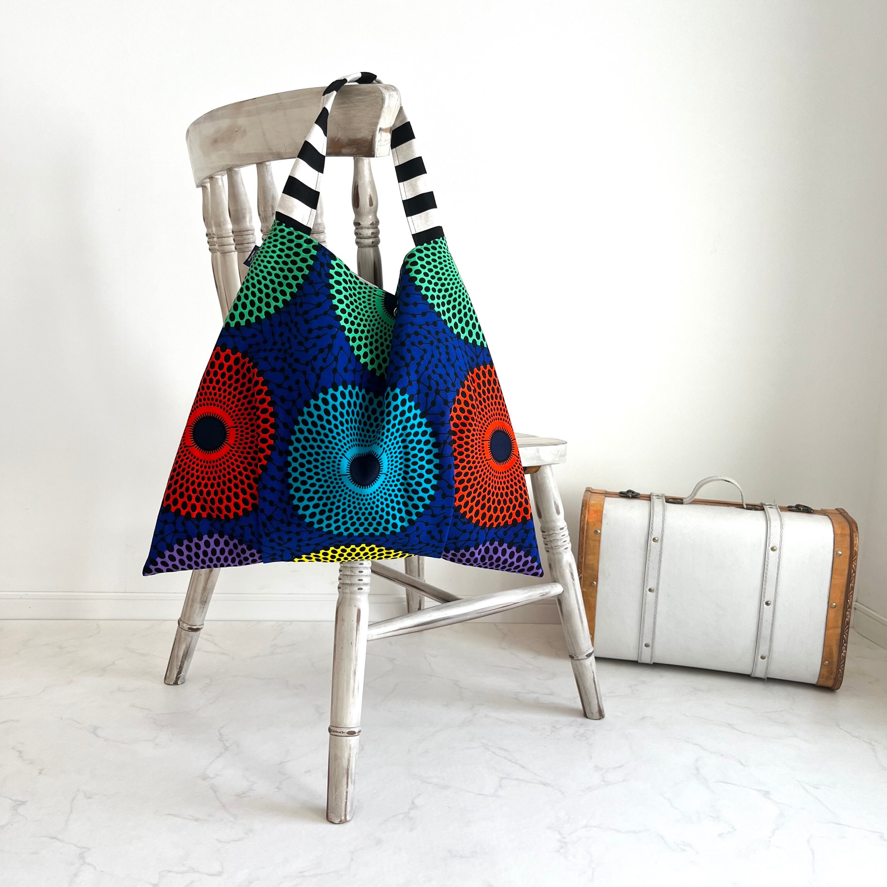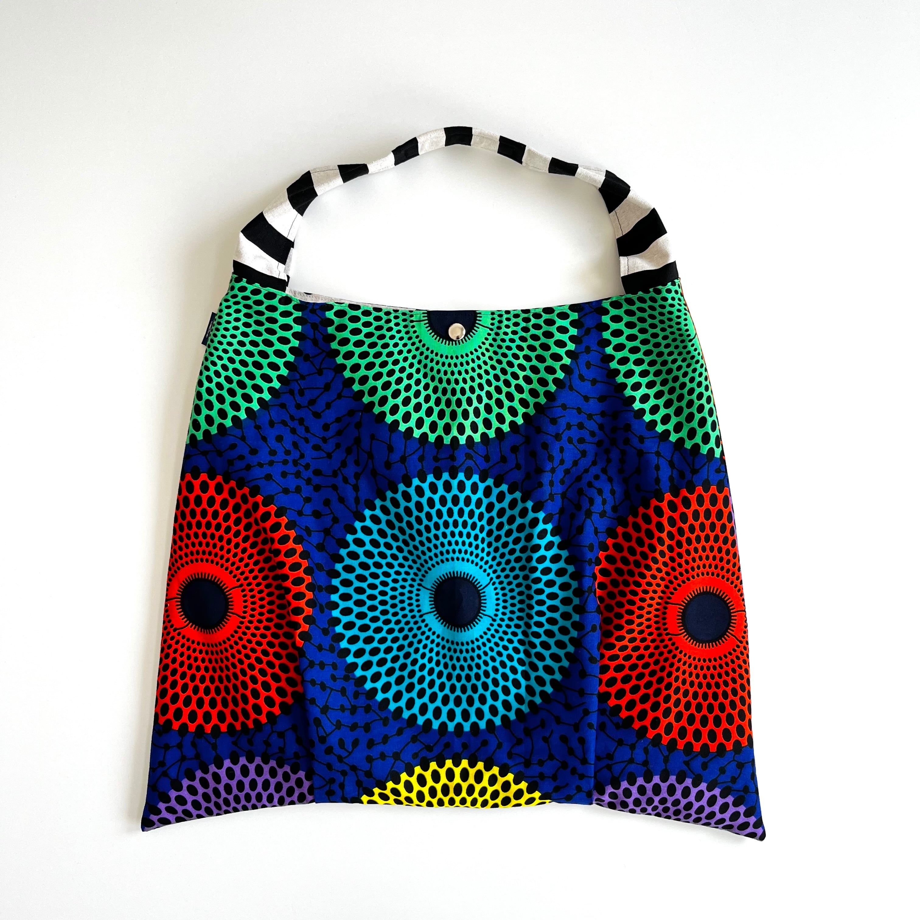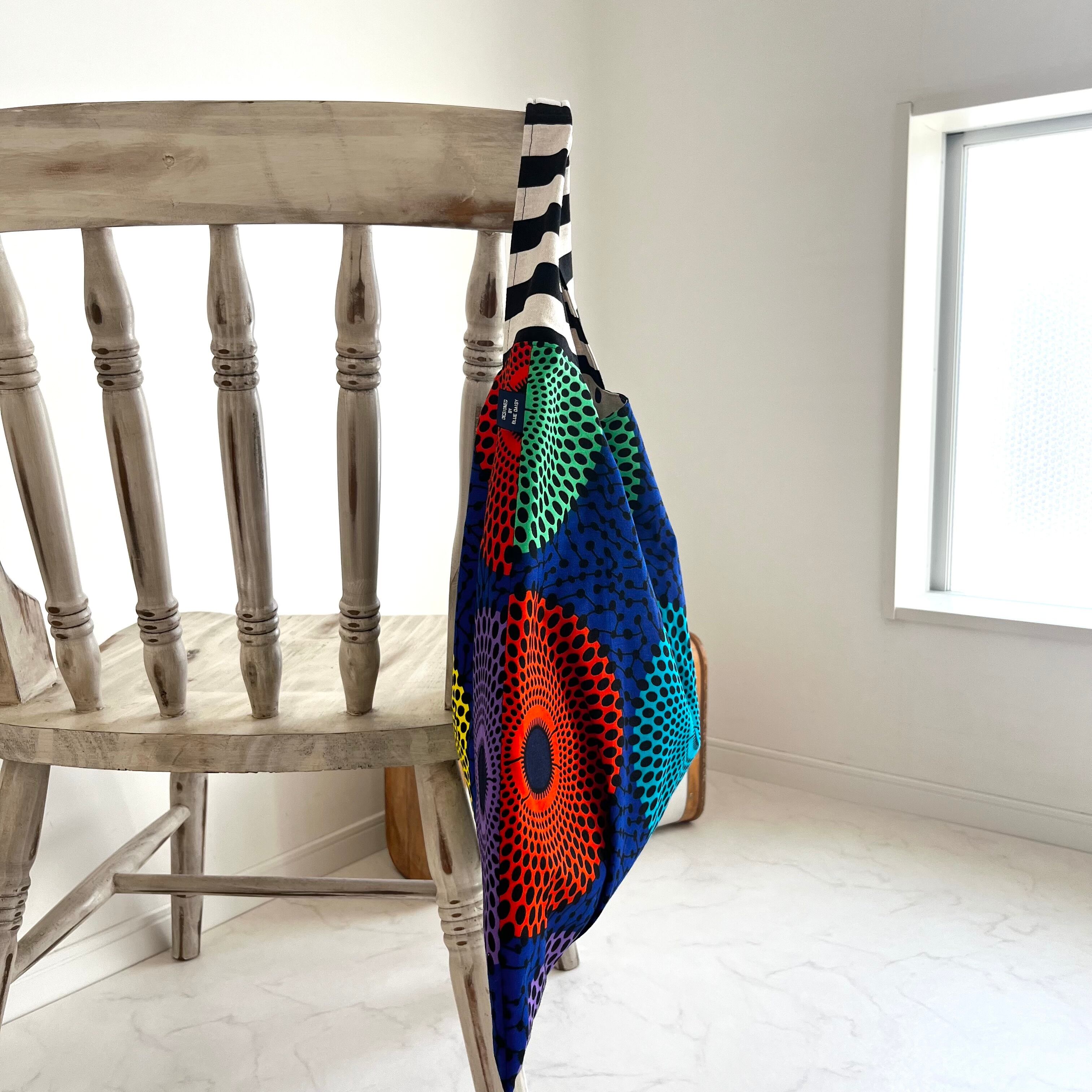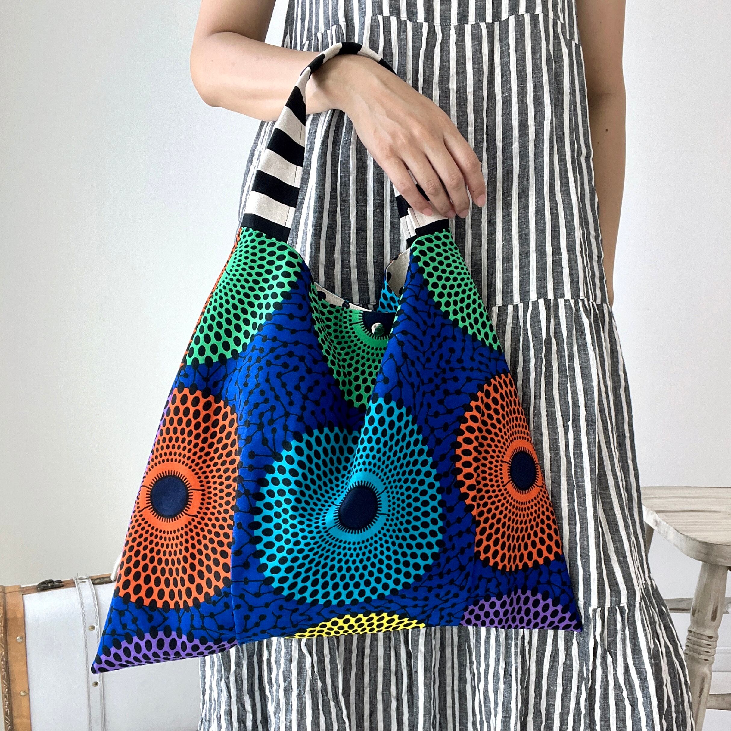 さんかくバッグ アフリカ布 水紋柄/ブルー×マルチカラー