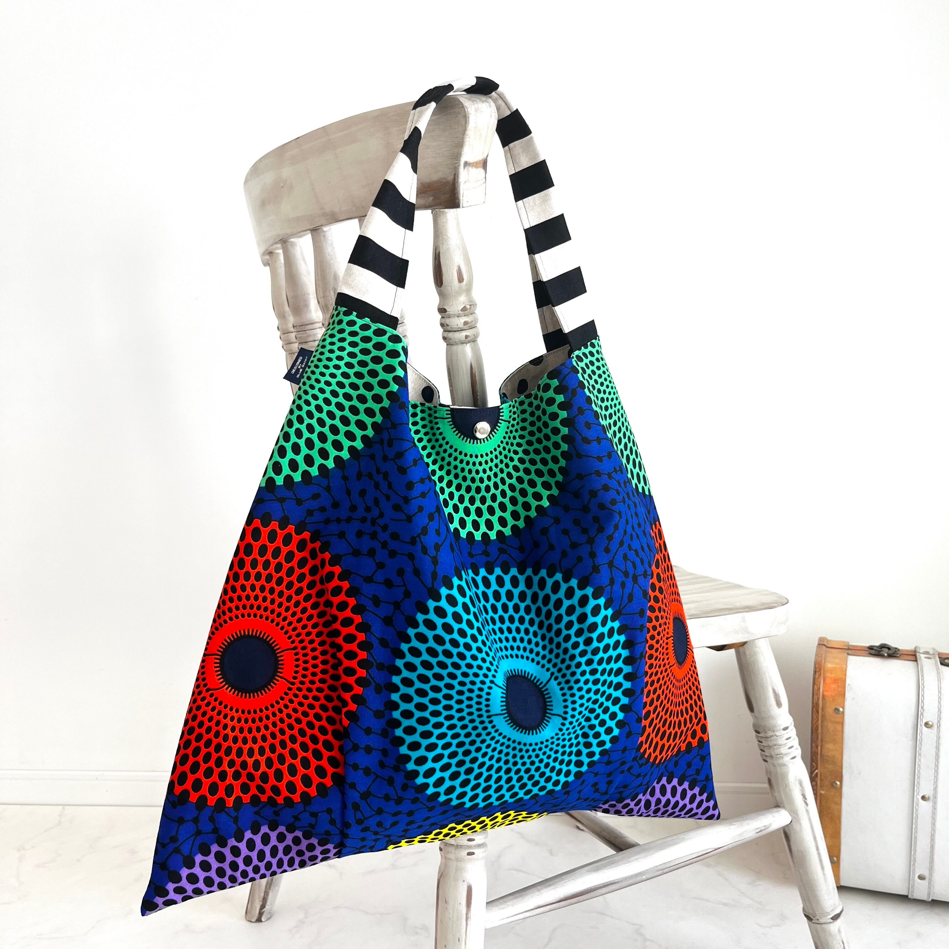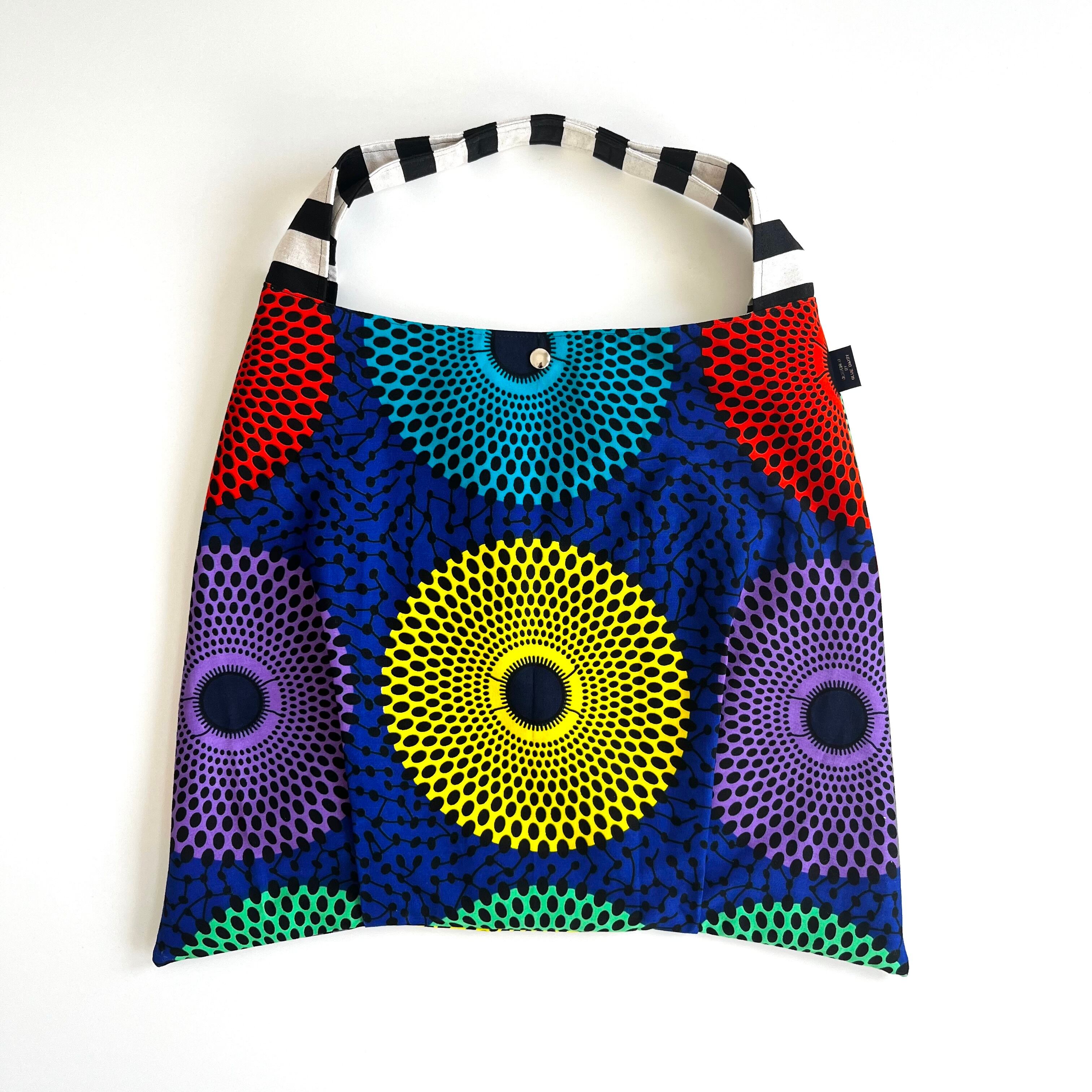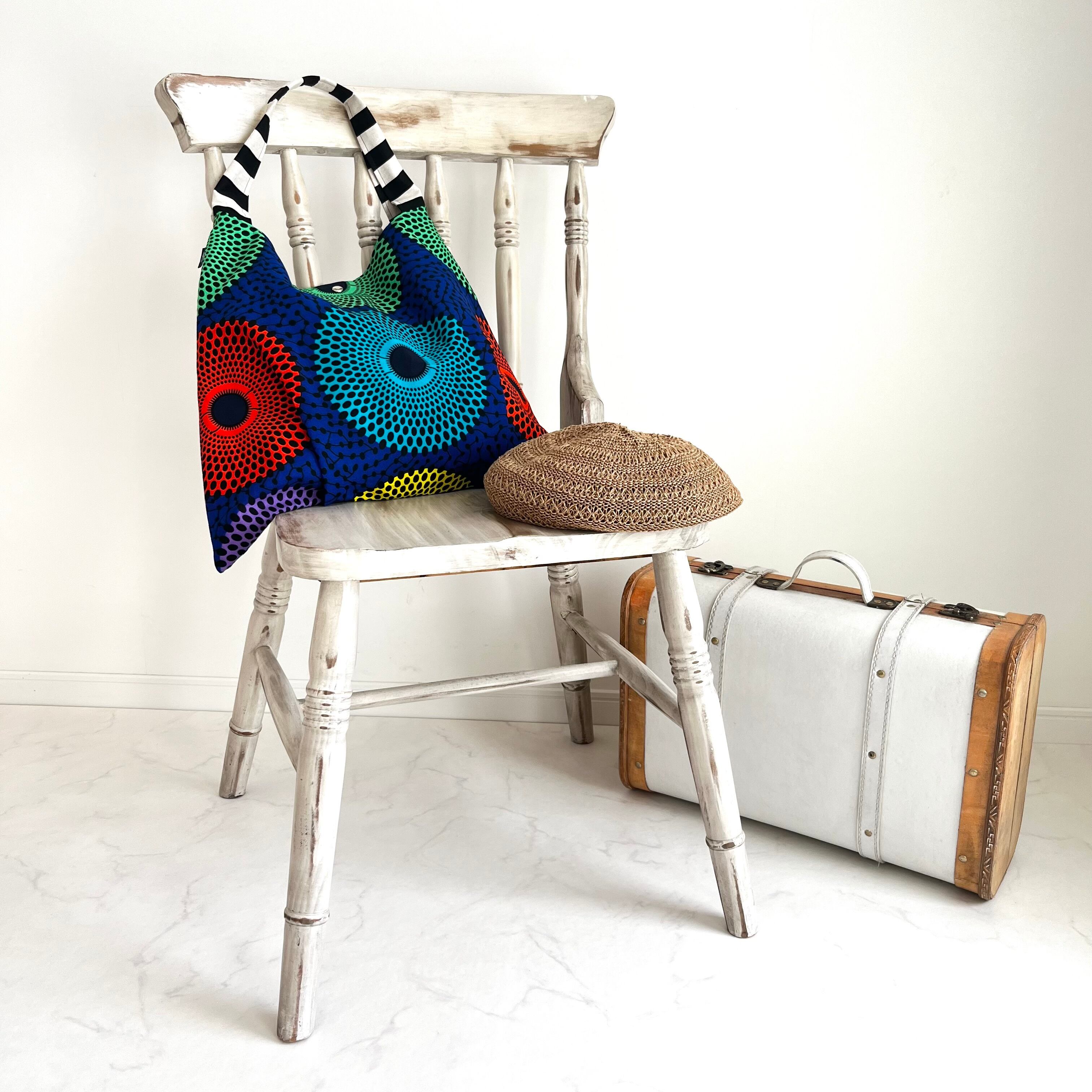 さんかくバッグ アフリカ布 水紋柄/ブルー×マルチカラー