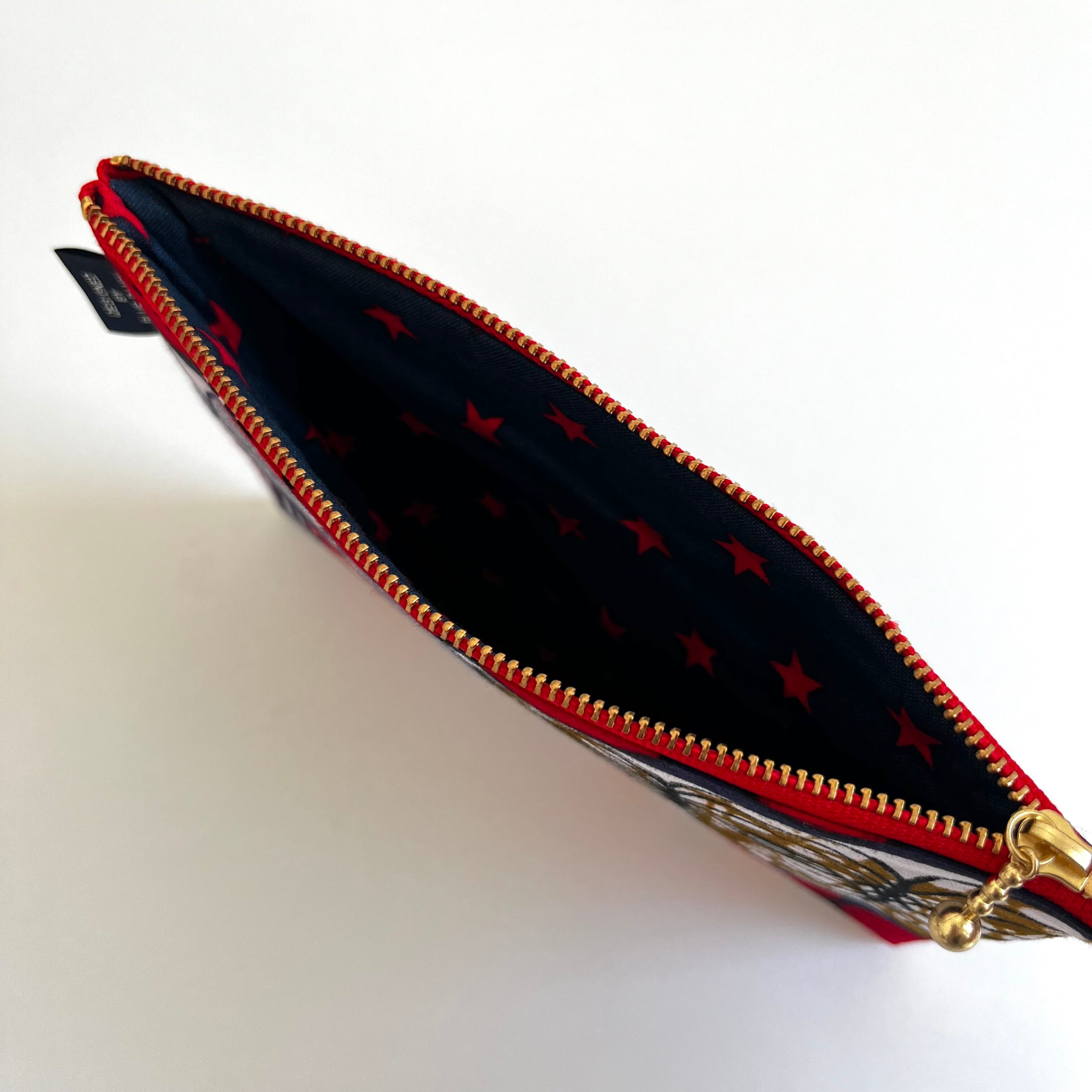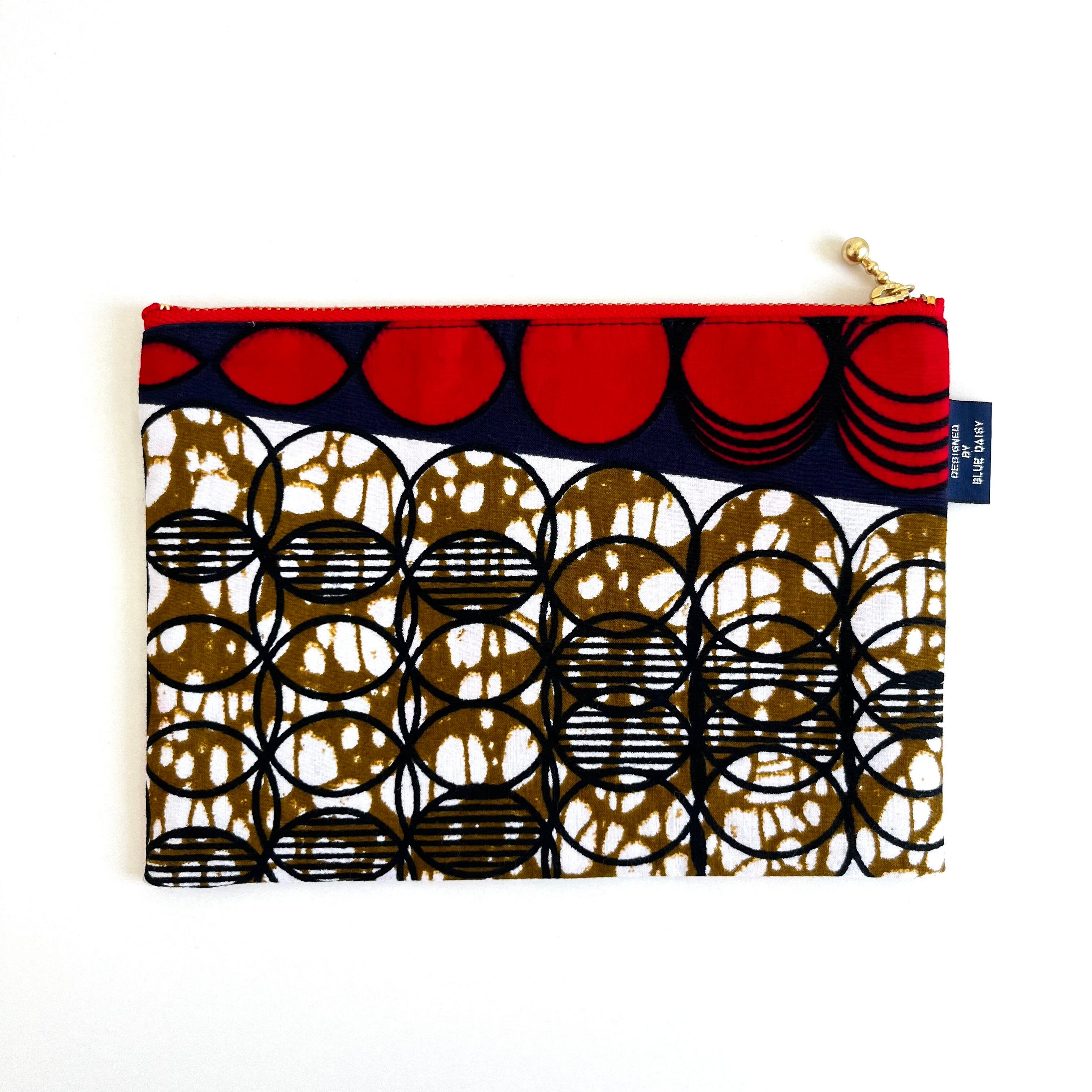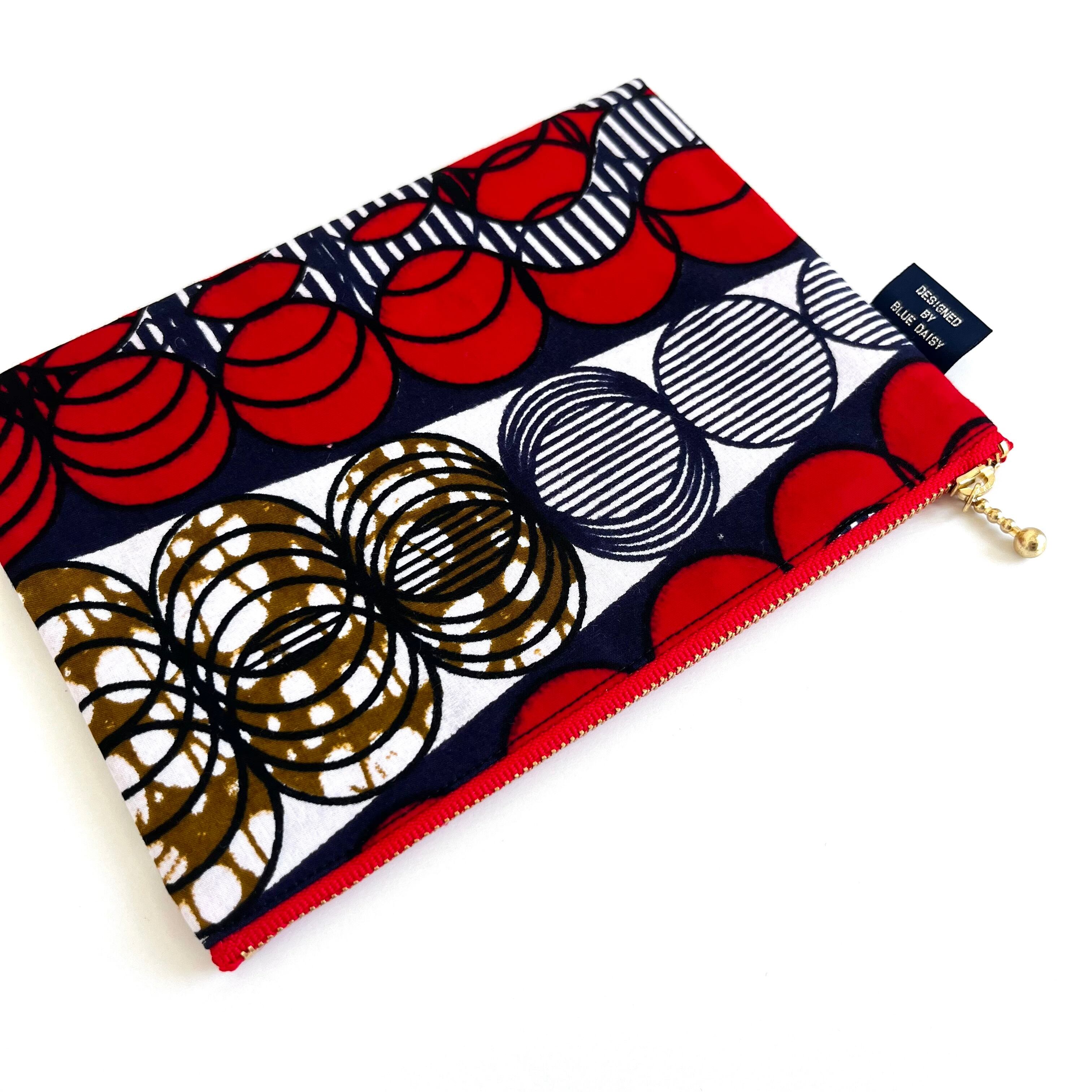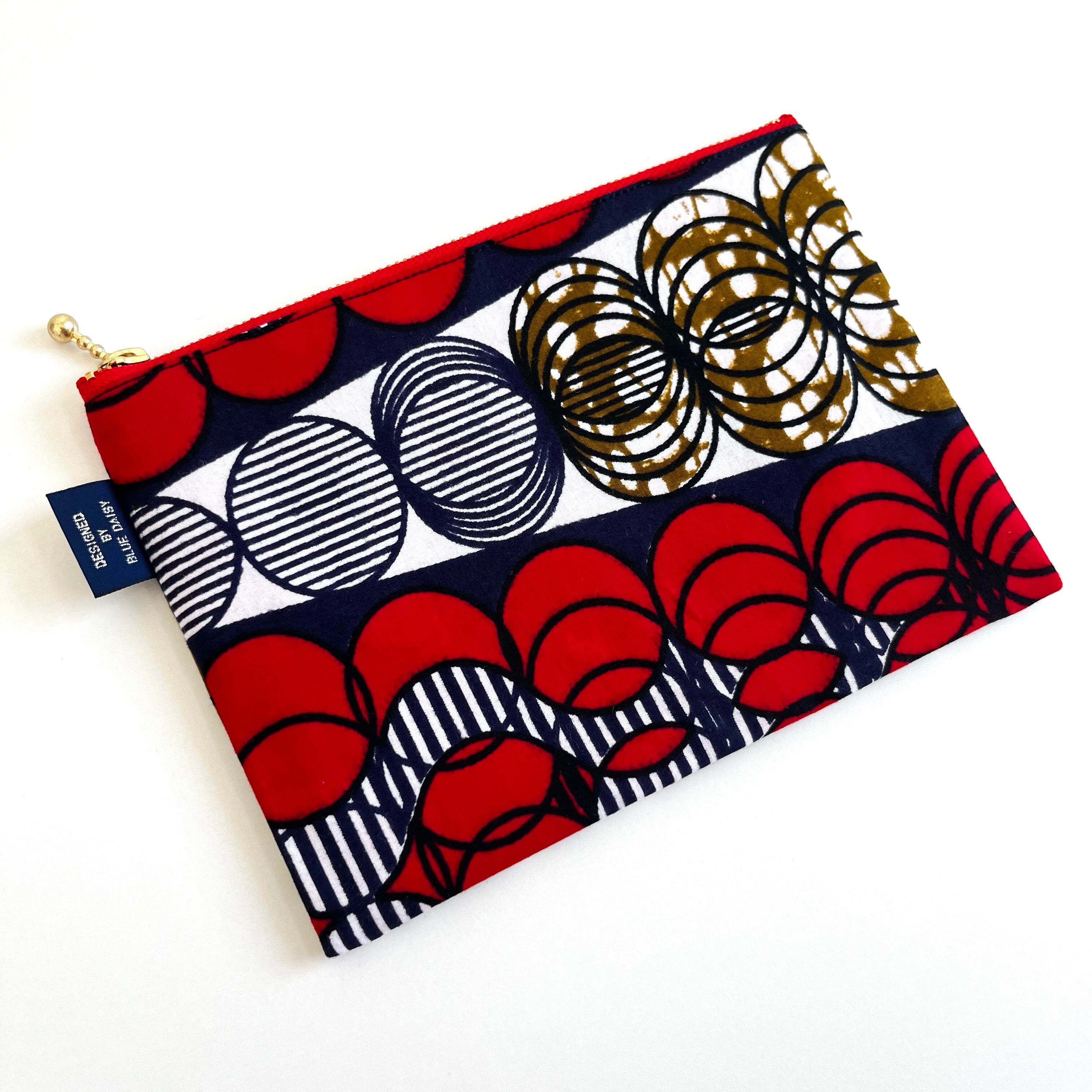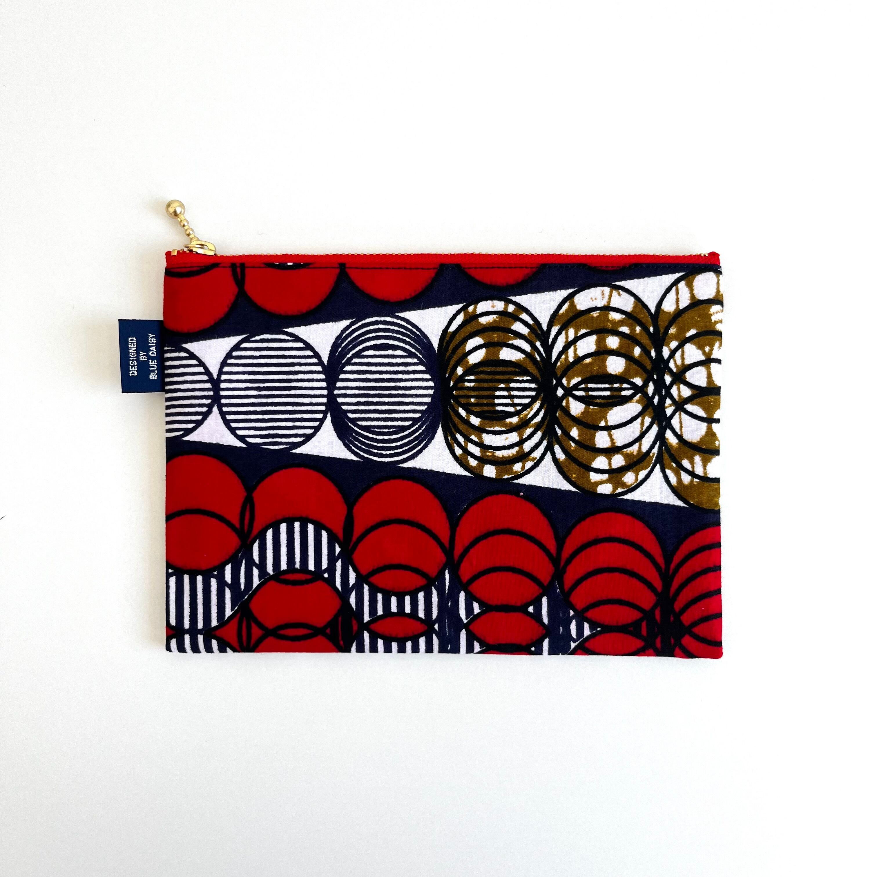 アフリカ布 ぺたんこポーチ Mサイズ スライドサークル/レッド&ネイビー