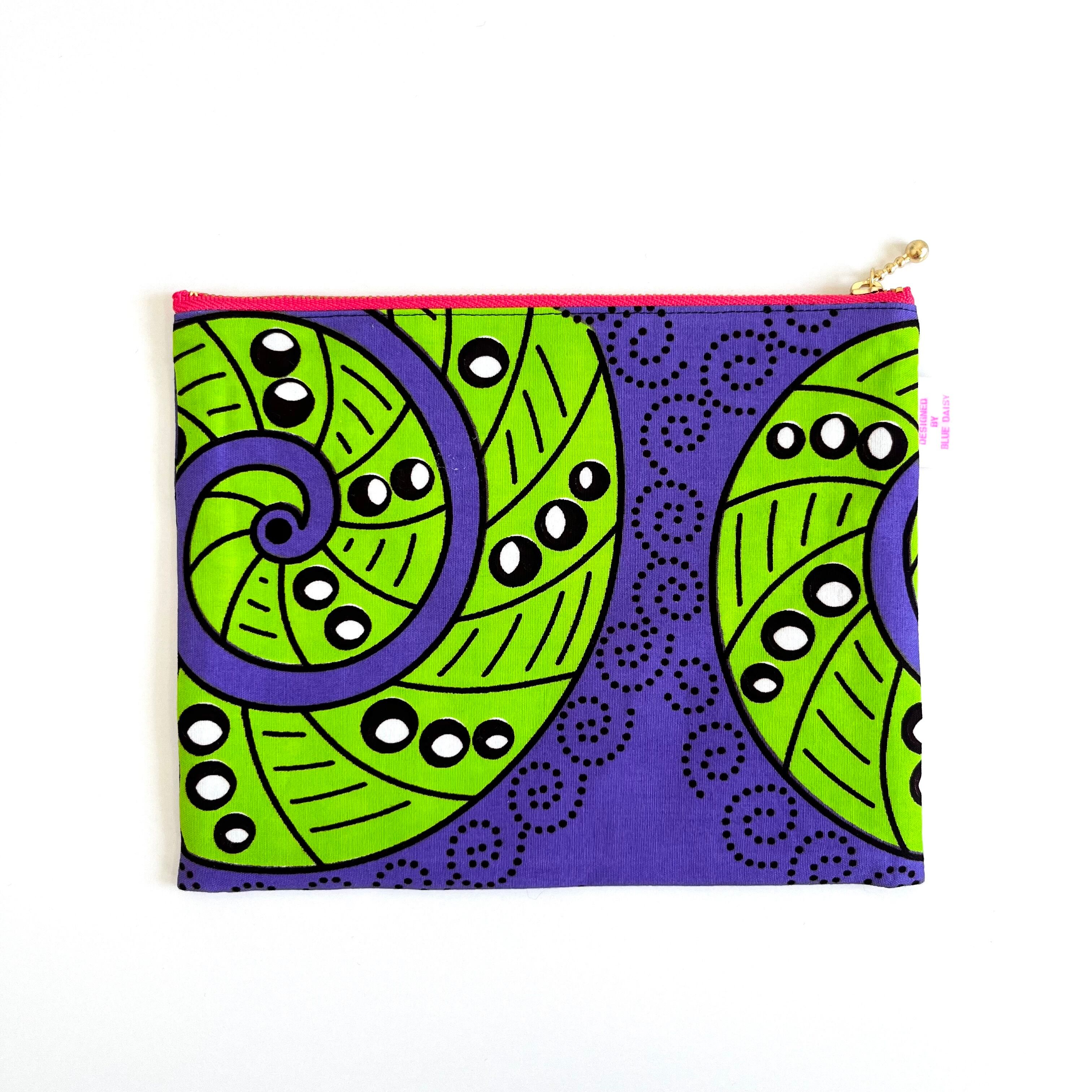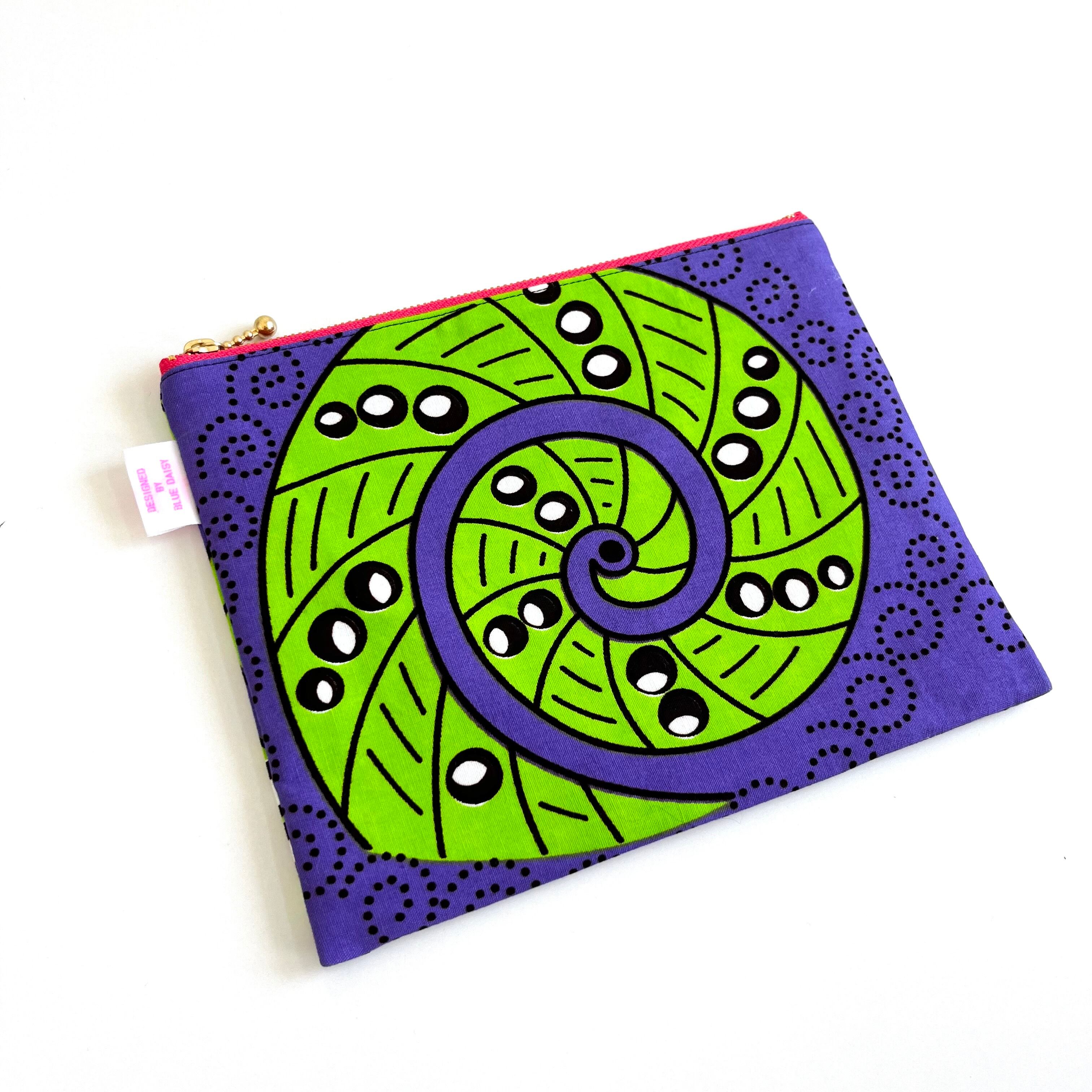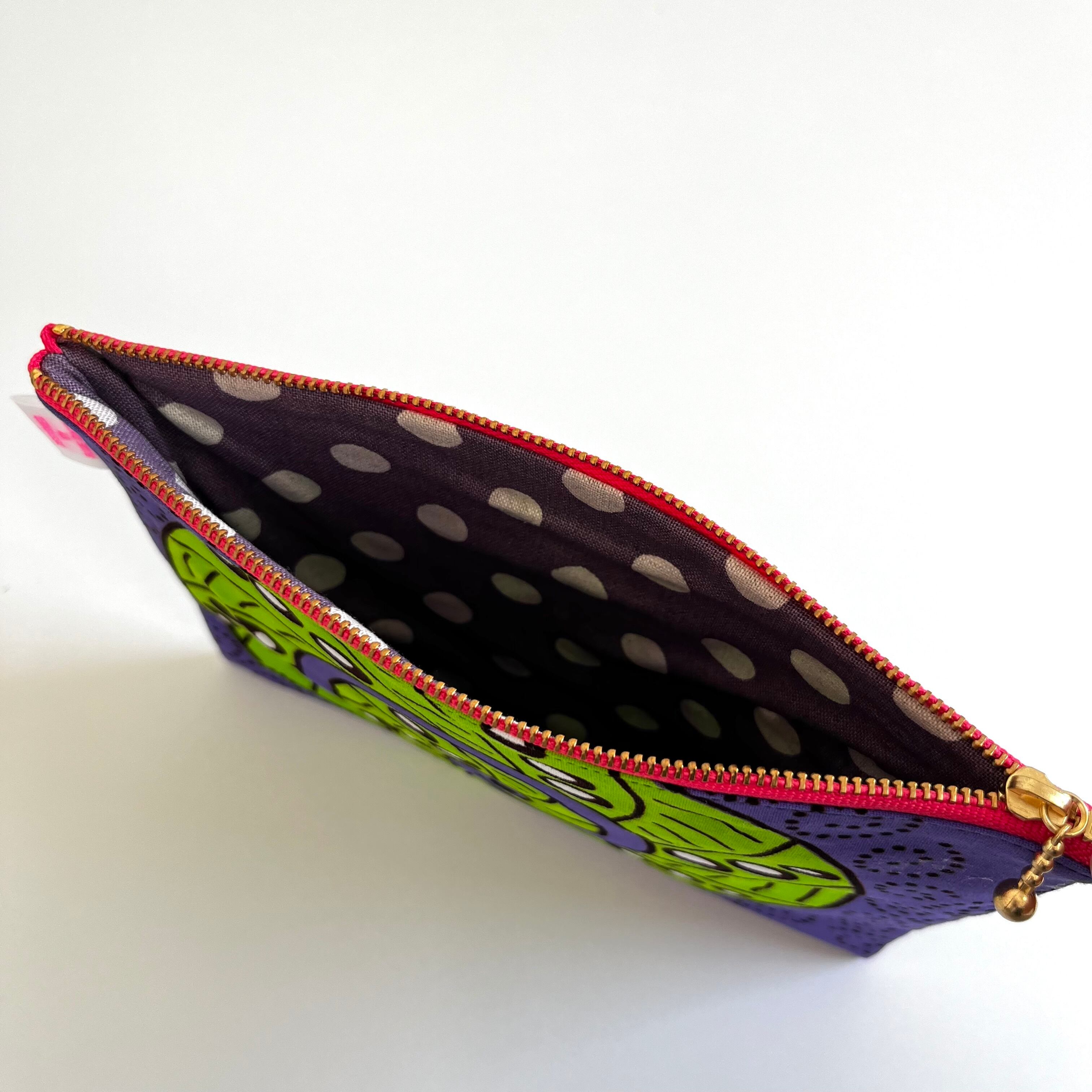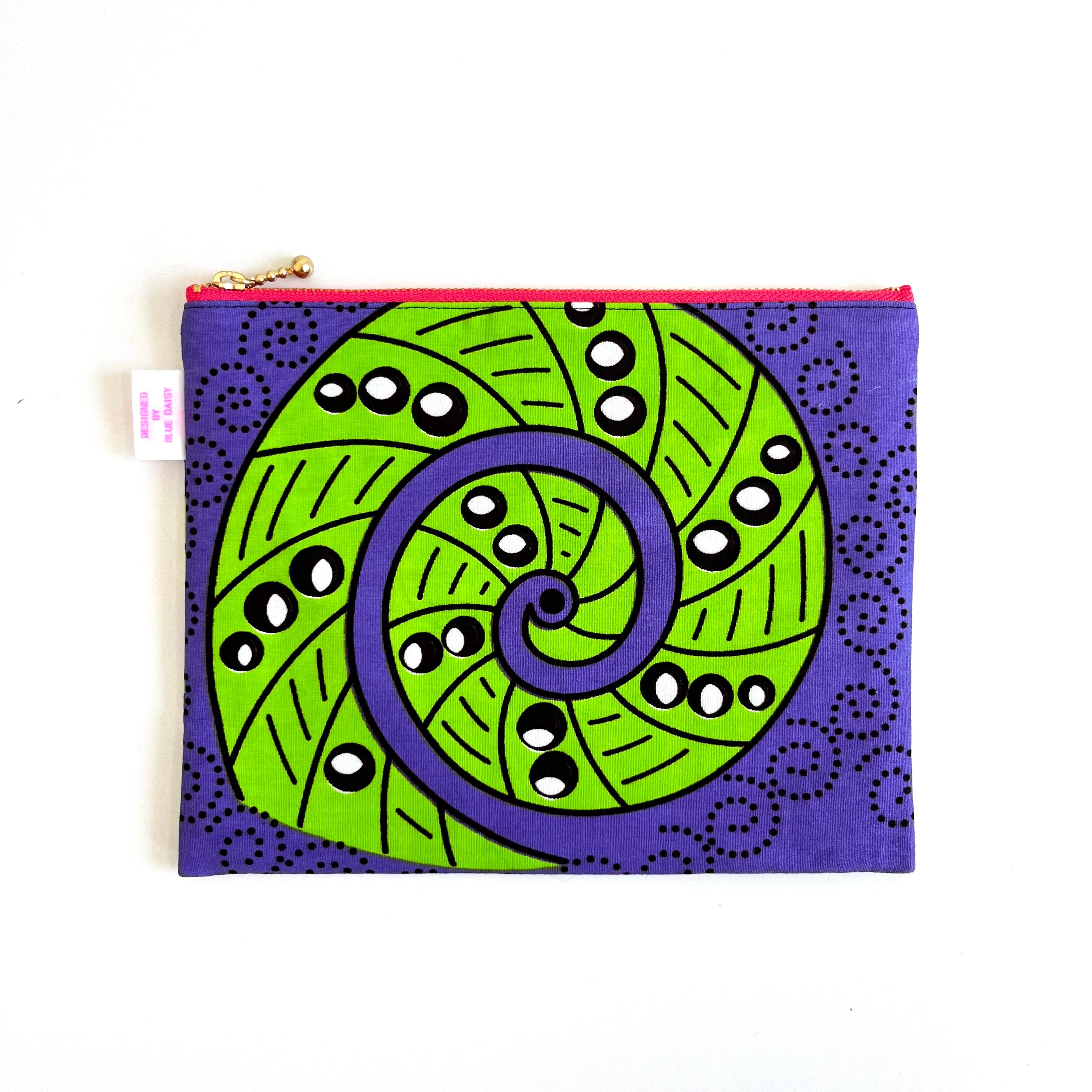 アフリカ布 ぺたんこポーチ Lサイズ ポップな螺旋 黄緑×パープル