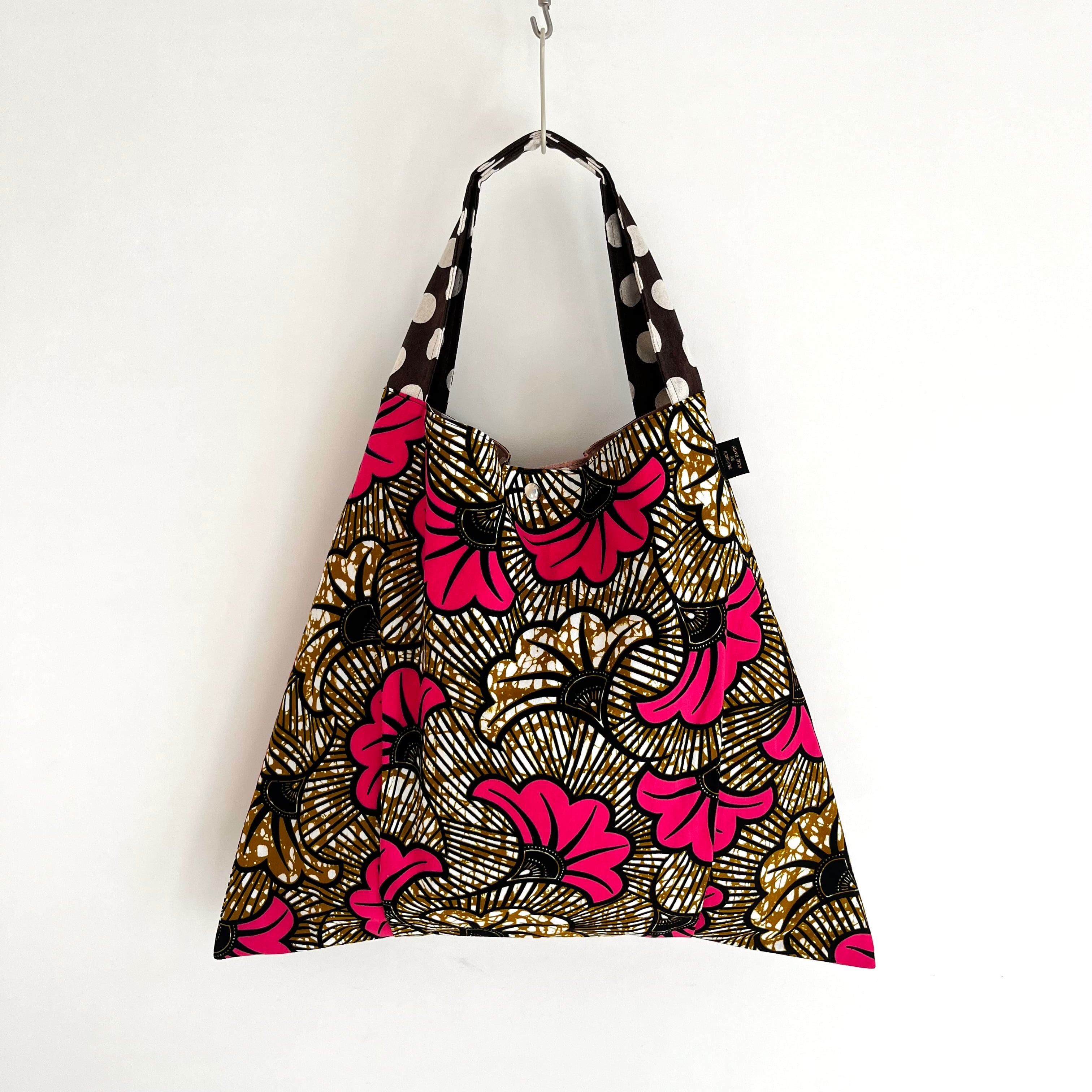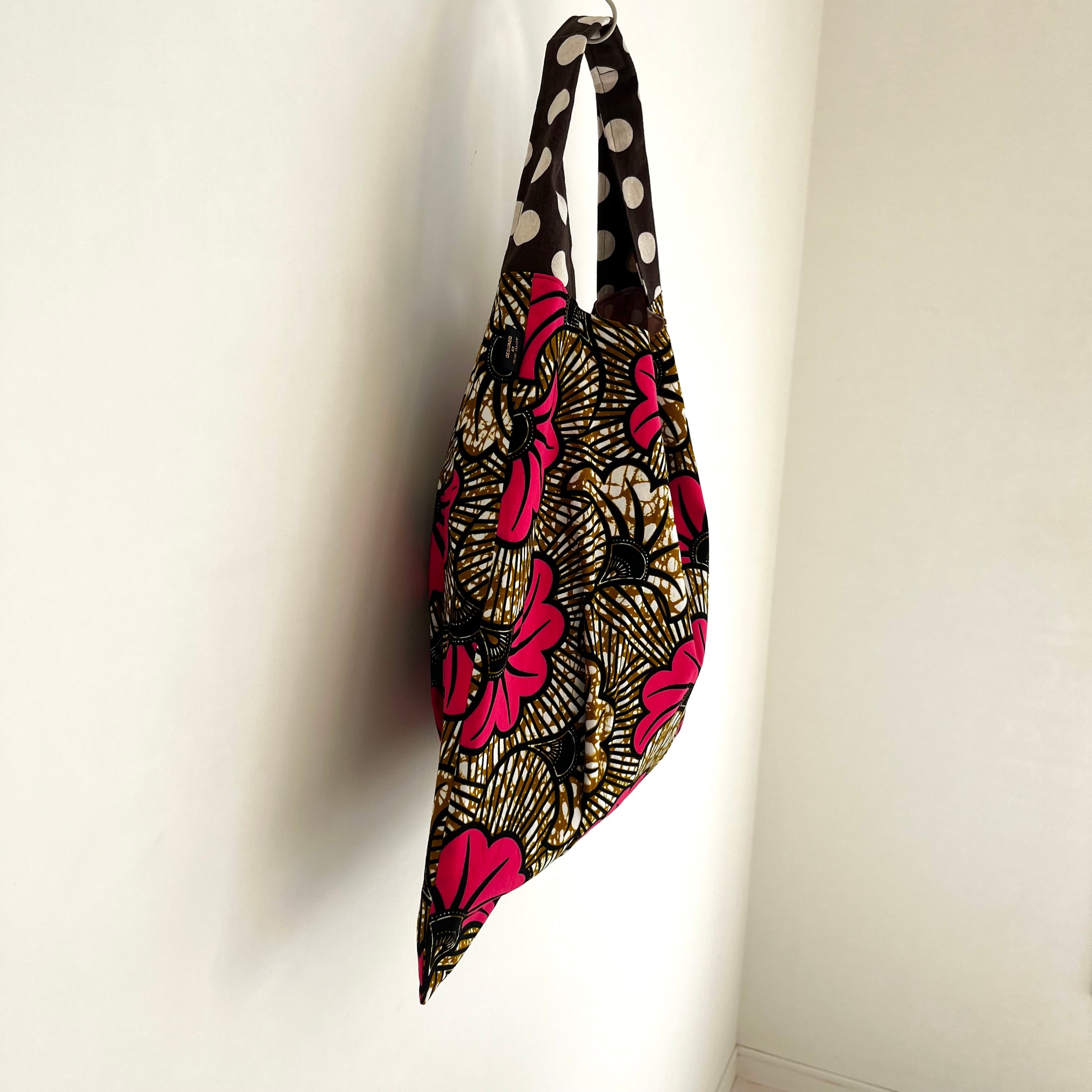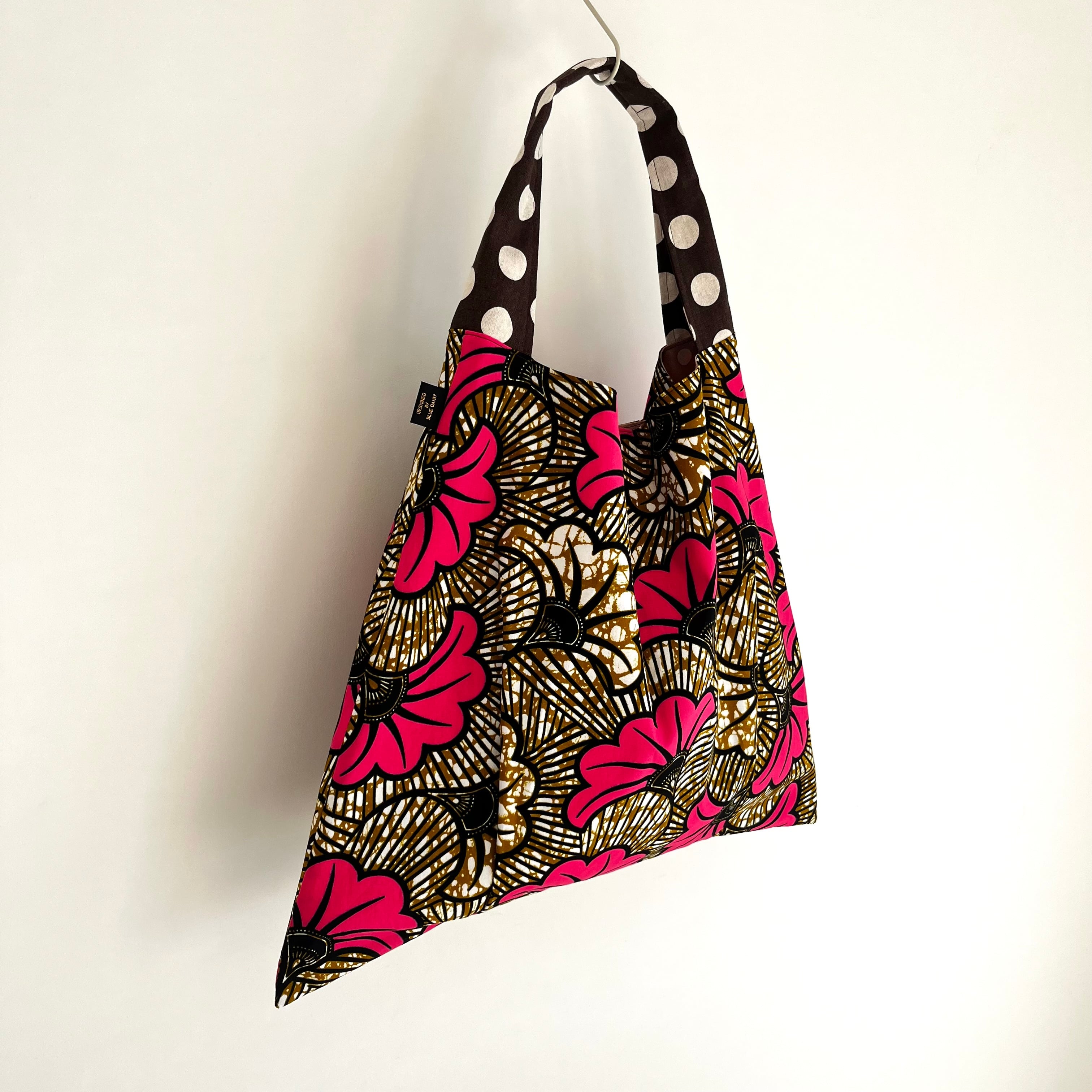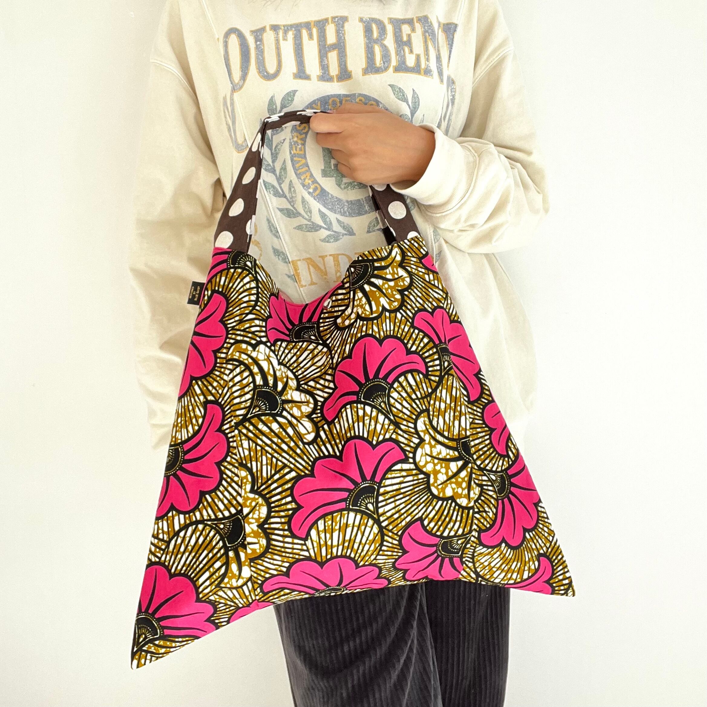 さんかくバッグ アフリカ布 イチョウ柄/ブラウン×ピンク