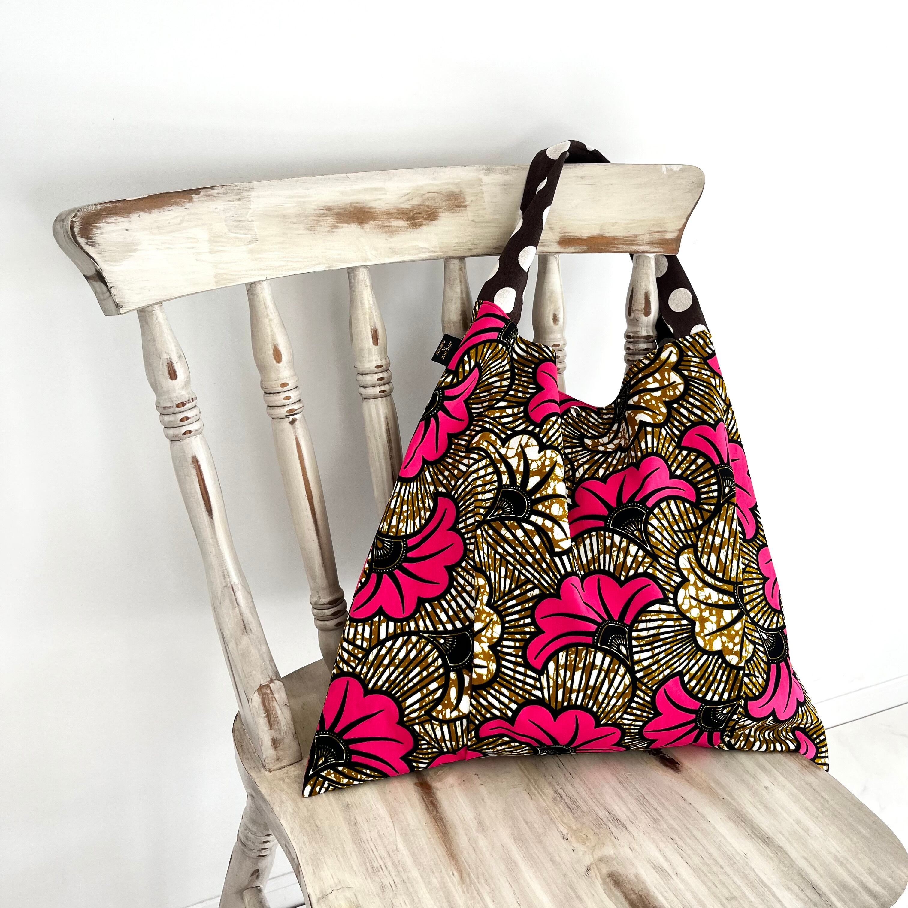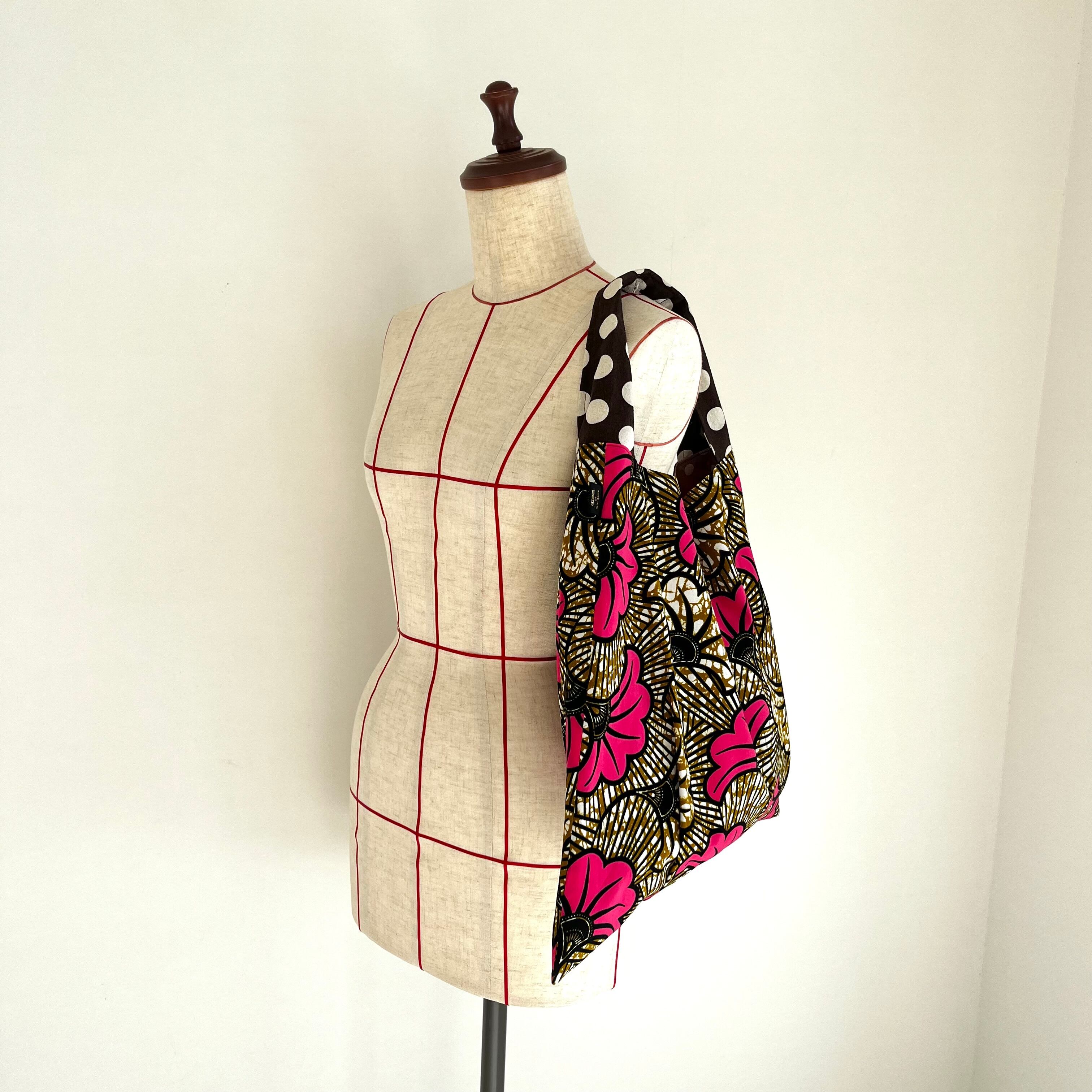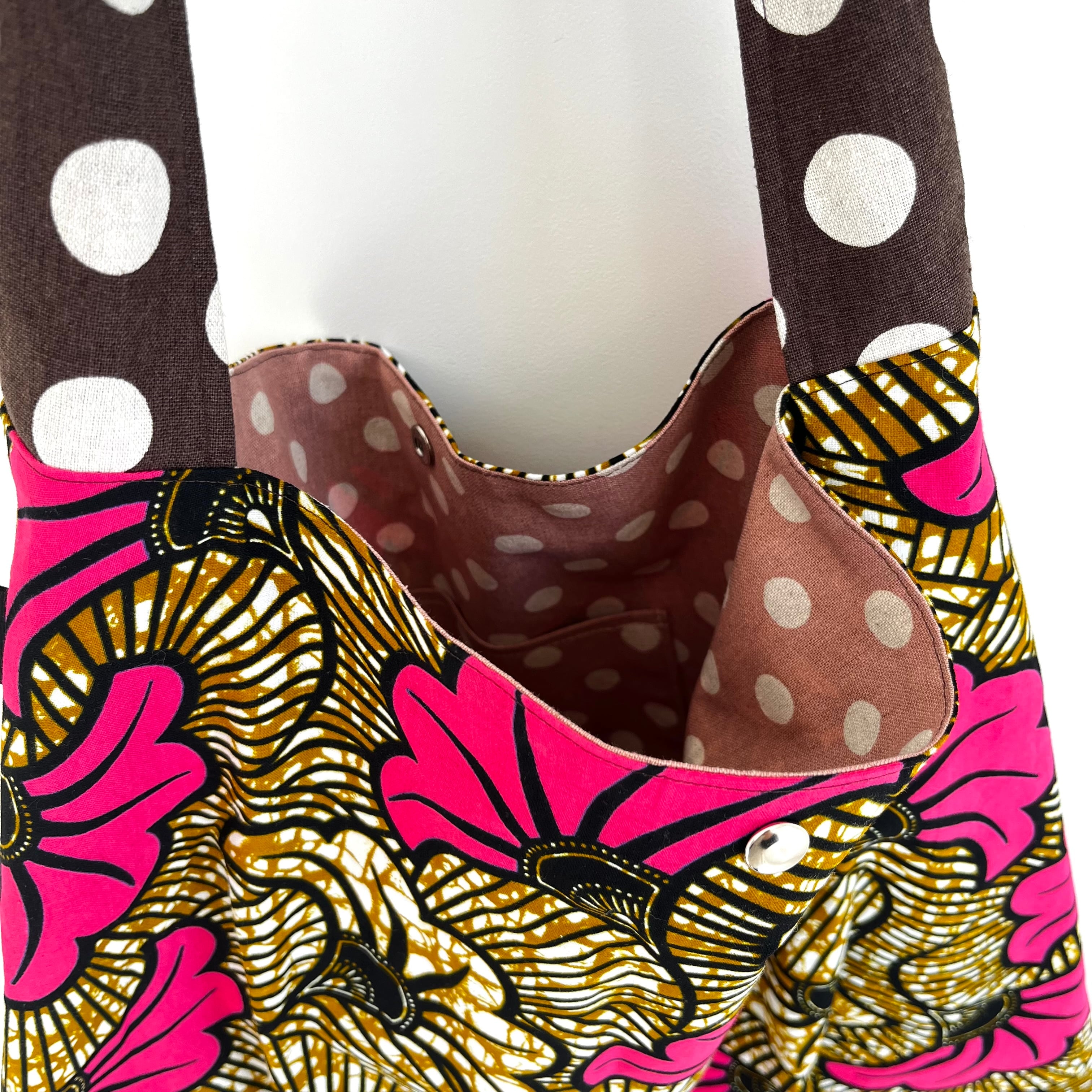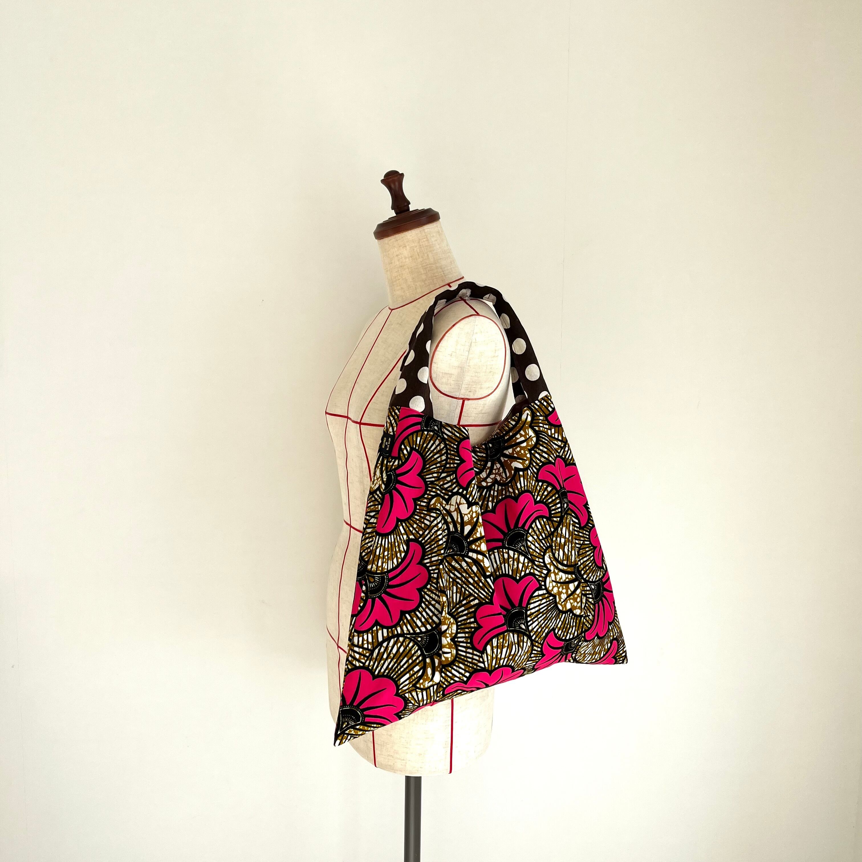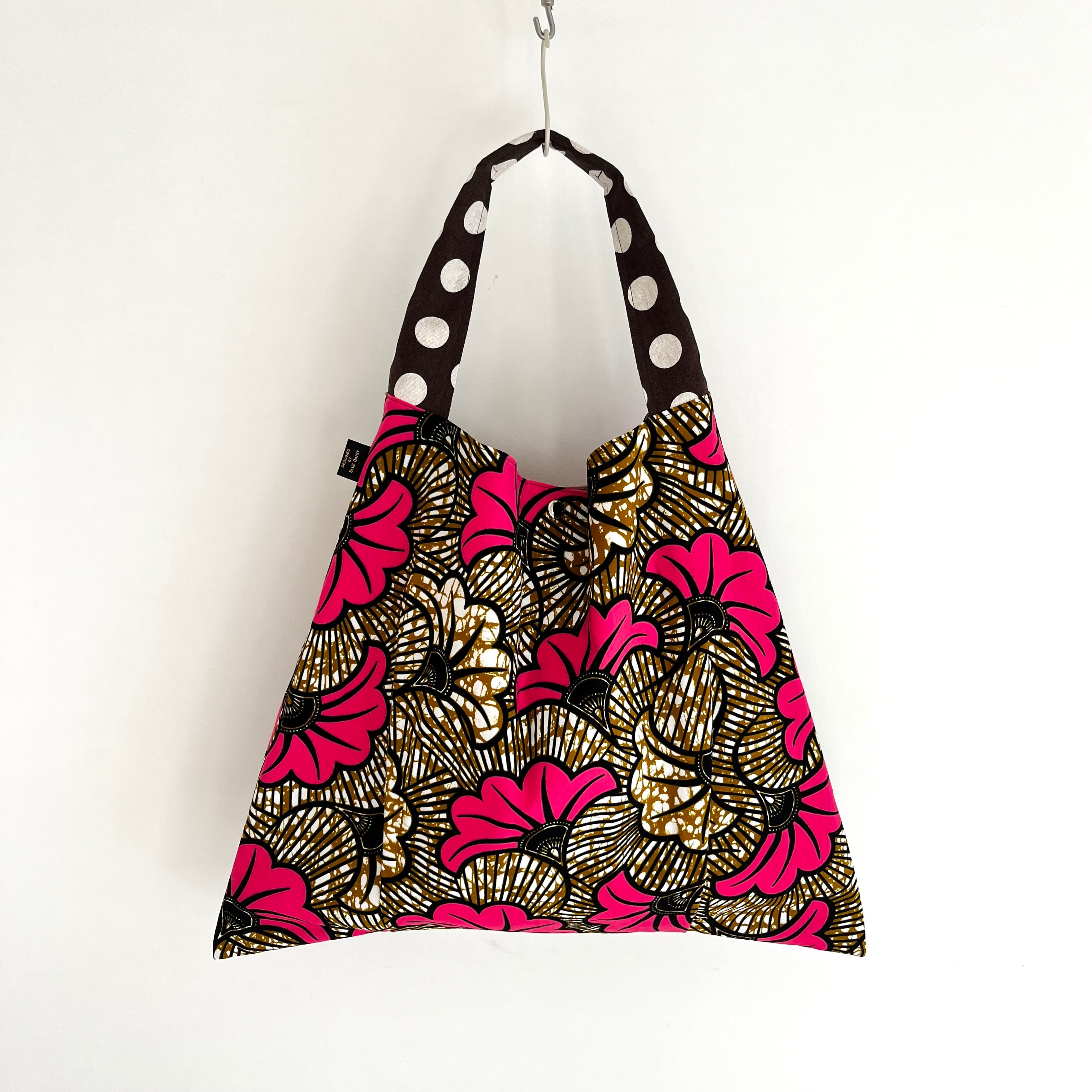 さんかくバッグ アフリカ布 イチョウ柄/ブラウン×ピンク