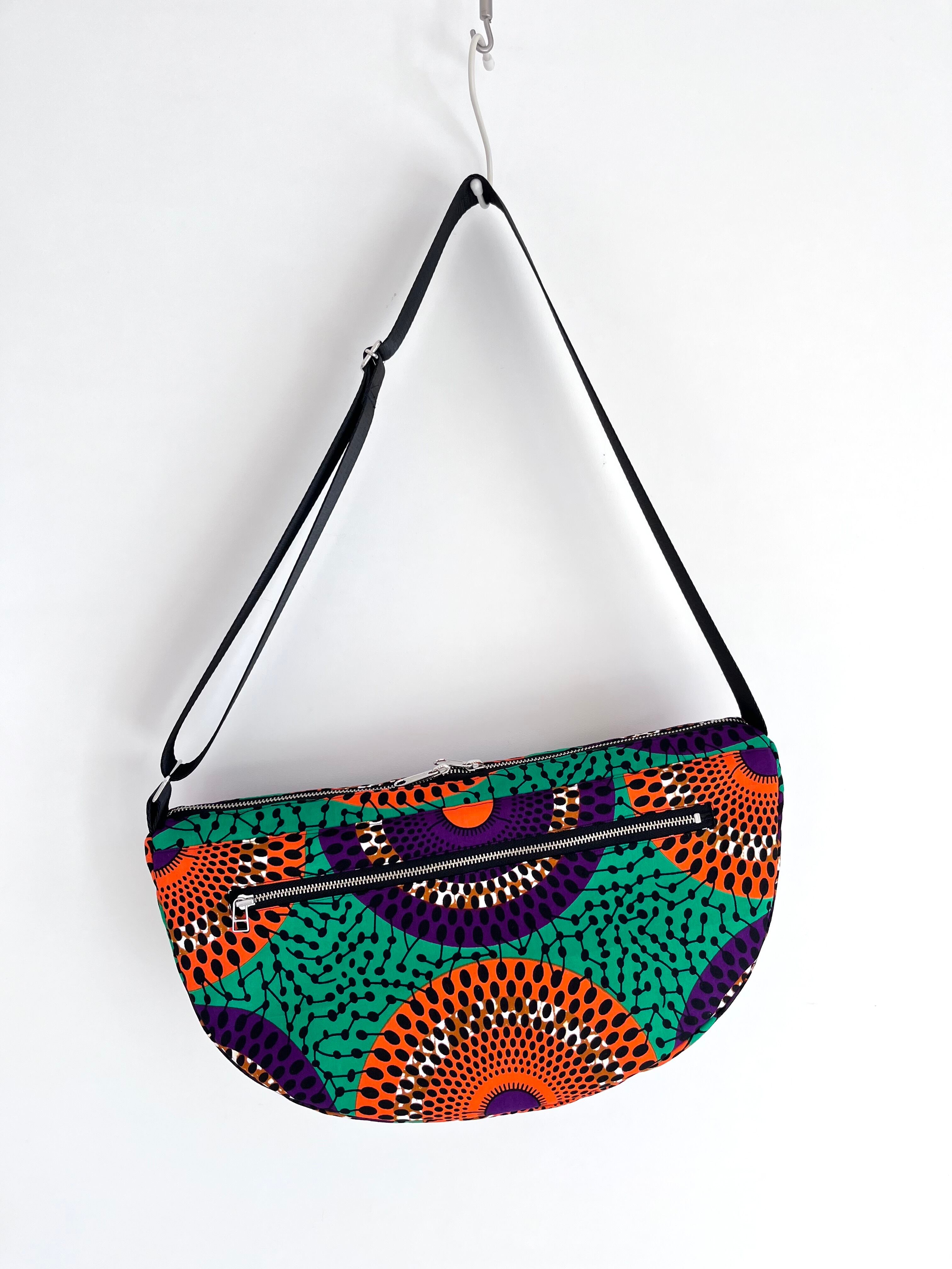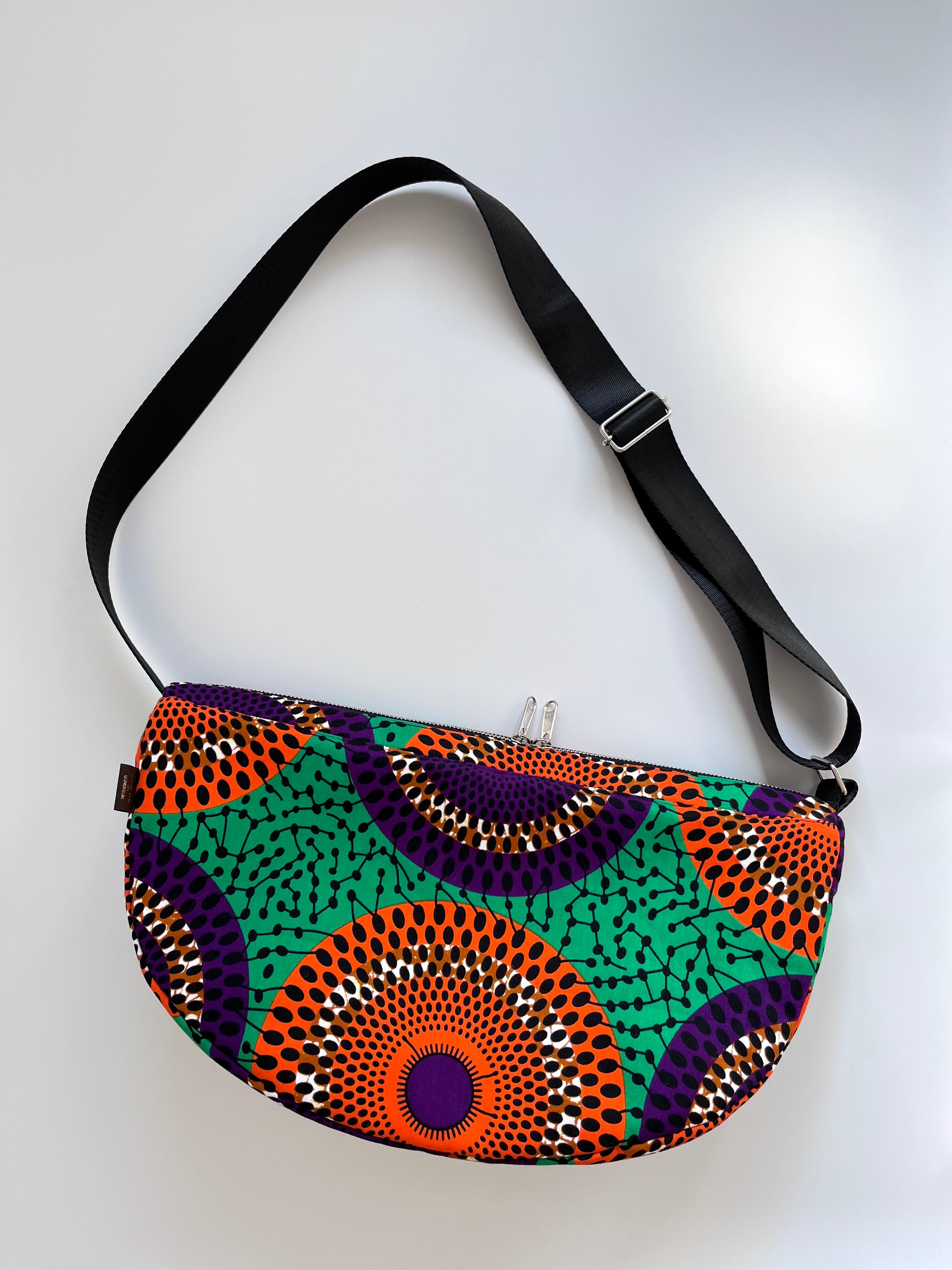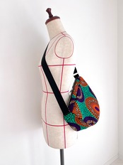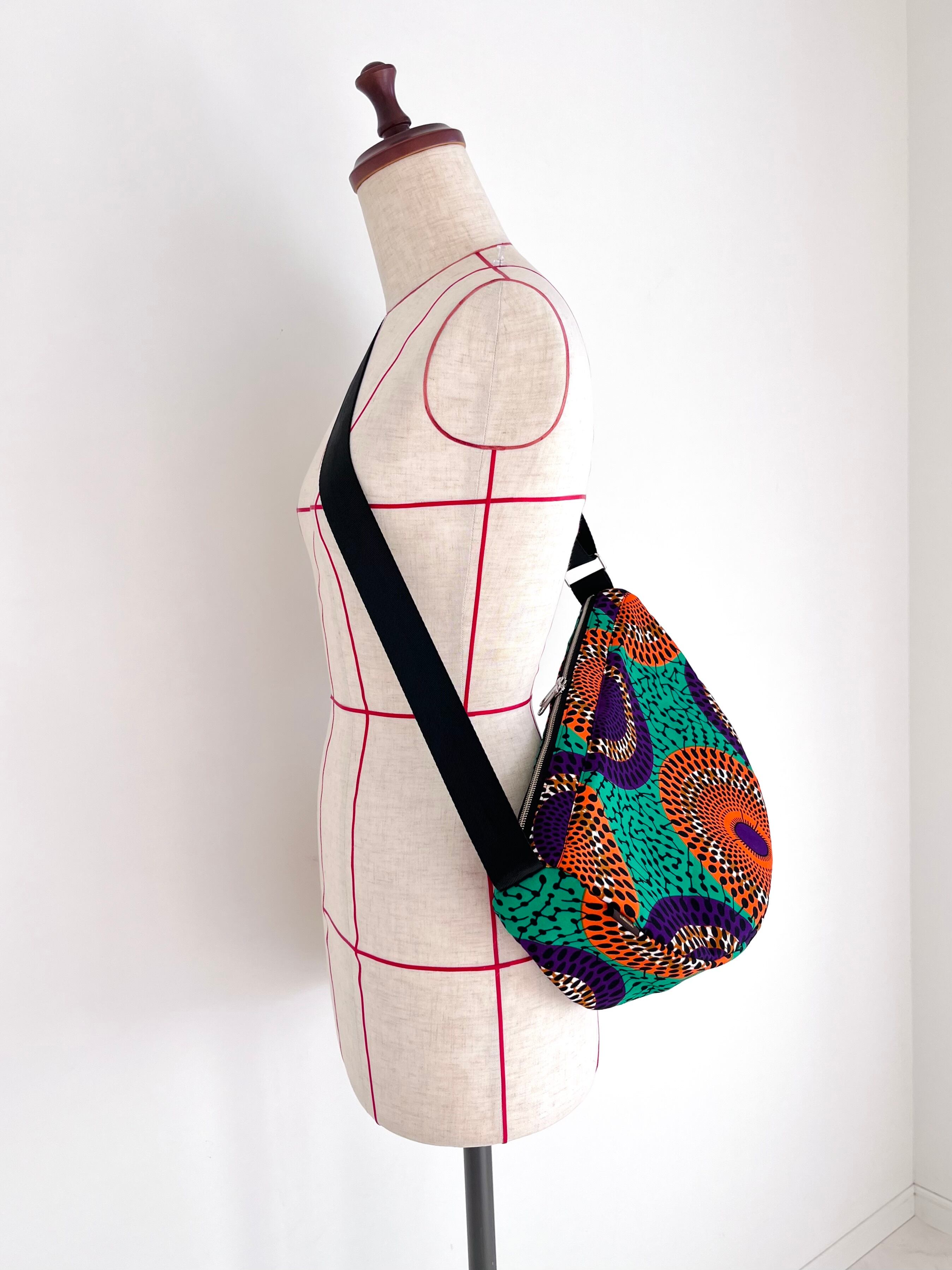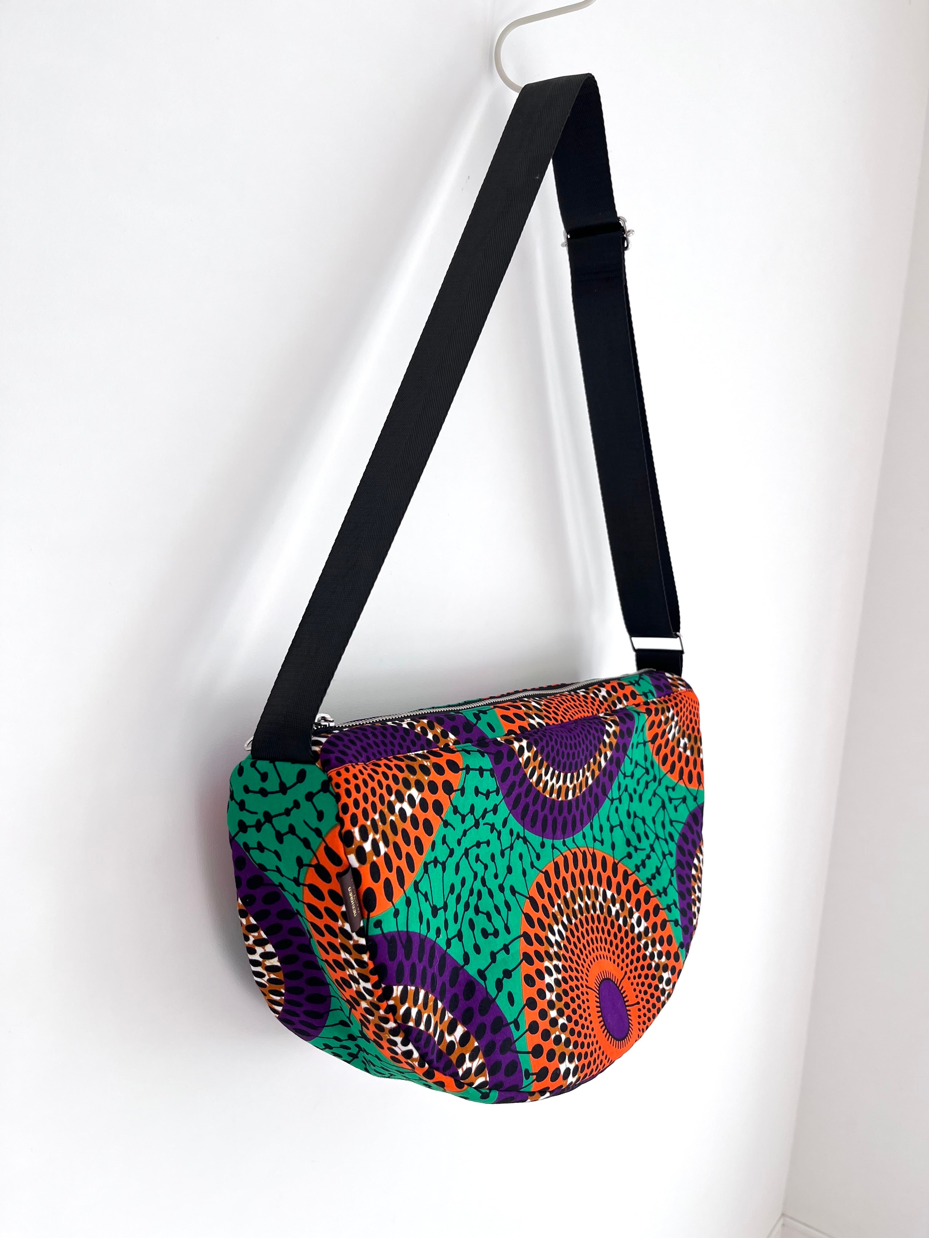 アフリカ布 ムーンバッグ 送料無料 ボディバッグ 水紋柄/緑地×オレンジ×パープル