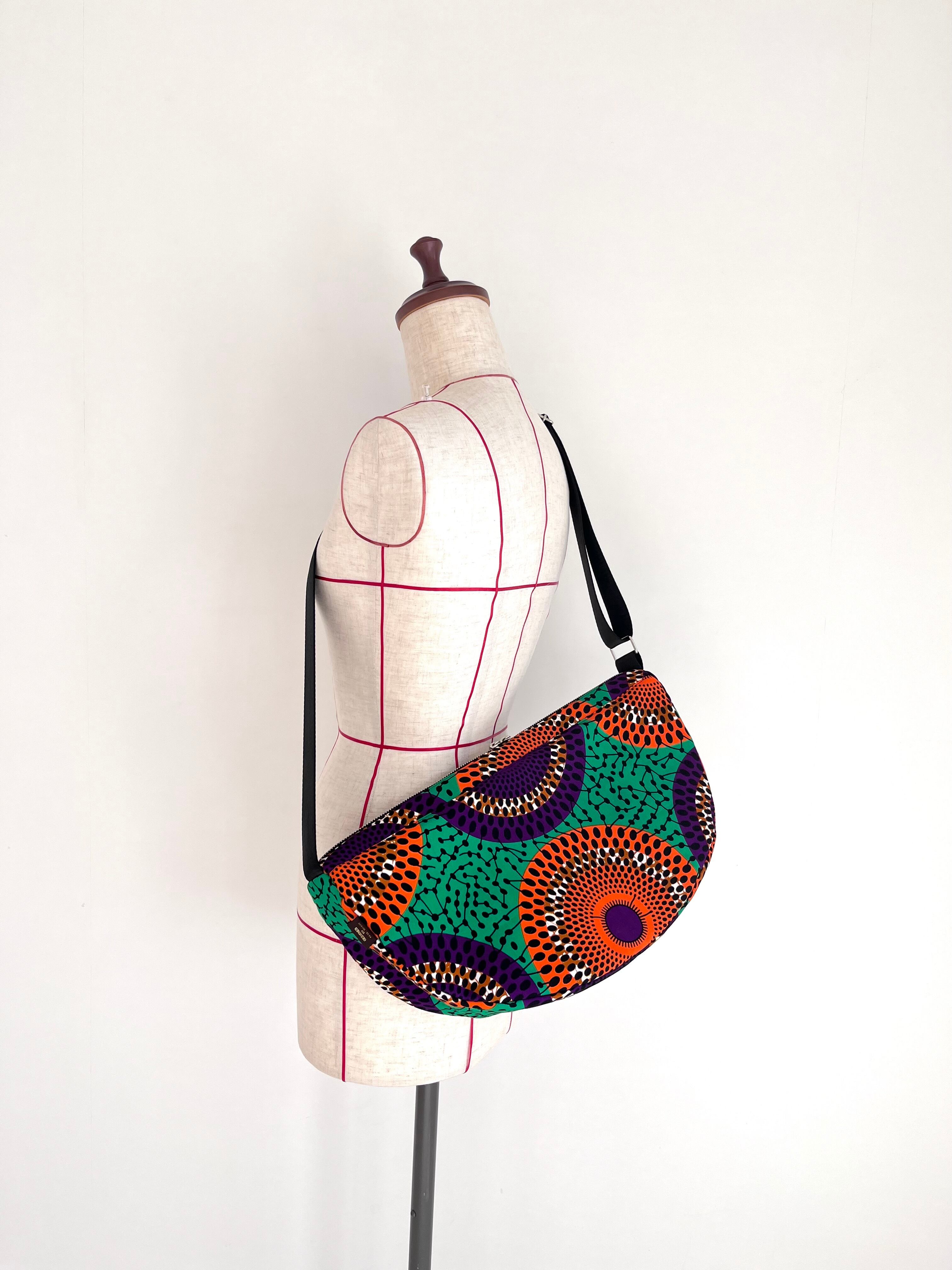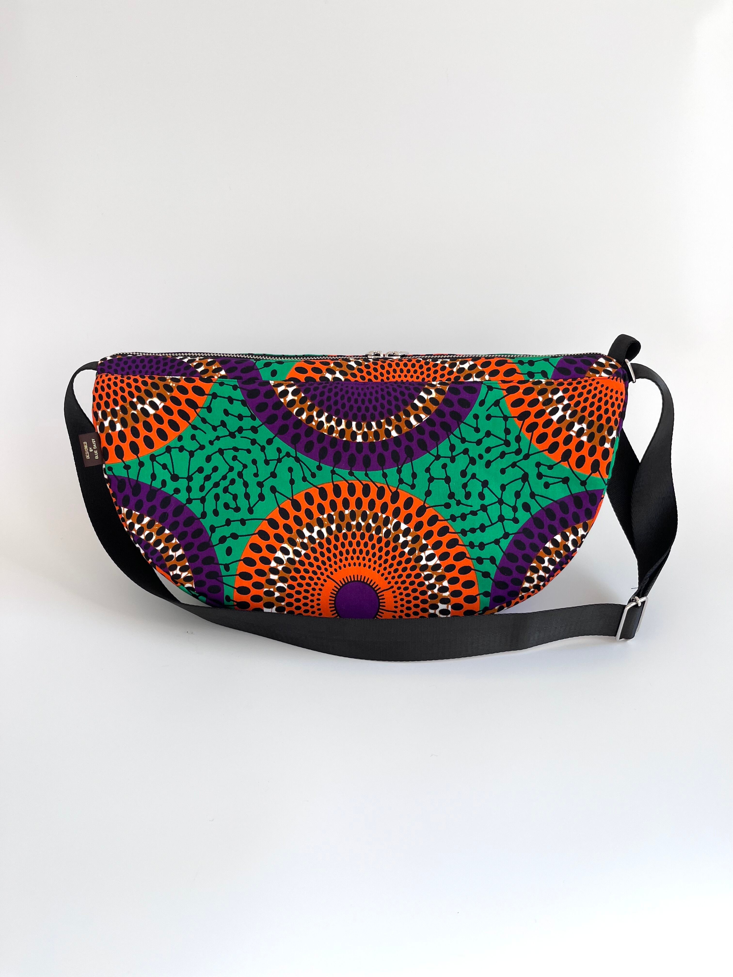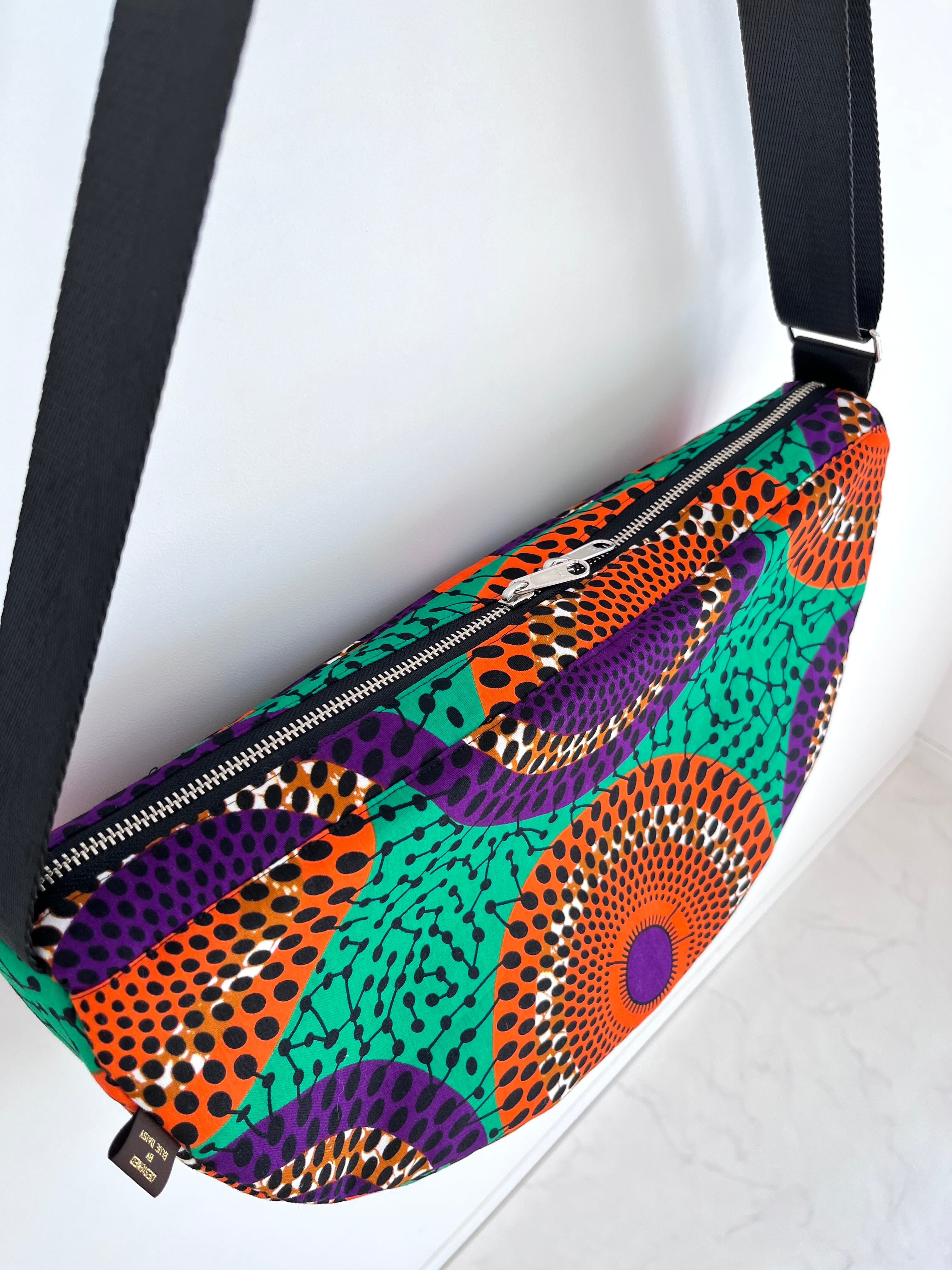 アフリカ布 ムーンバッグ 送料無料 ボディバッグ 水紋柄/緑地×オレンジ×パープル